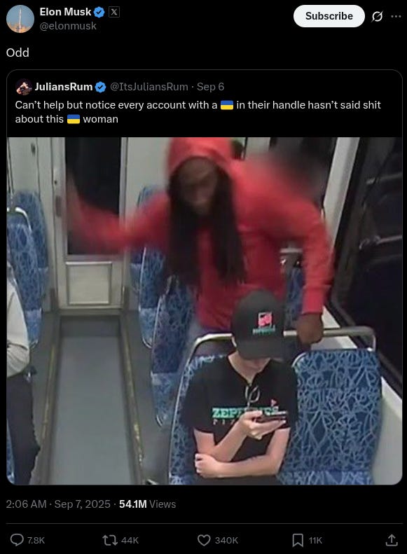 Musk also pointed out the absurdity of leftists who claim to support Ukraine having nothing to say about the violent killing of a Ukrainian refugee.