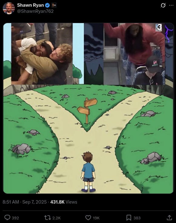 “Yet you wouldn’t shut up or stop villainizing Daniel Penny, a hero, who probably stopped a murder just like her’s. Why? Because he was a straight white American male and the perp was black,” Kirk added.