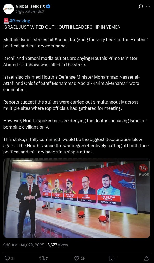 Israel had intentionally targeted a significant gathering of top civilian and military leadership in the capital of Sanaa with huge daytime strikes Thursday afternoon. Israel's military had soon after announced that it "precisely struck a Houthi terrorist regime military target in the area of Sanaa in Yemen."