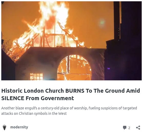 The same erosion continues across Europe, where centuries-old Christian landmarks are torched with disturbing regularity. Authorities routinely treat these incidents as random “accidents” or downplay motives, even as critics highlight unchecked mass immigration from populations often hostile to Western Christian heritage.