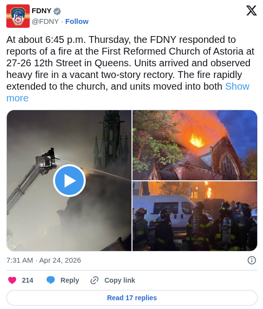 X users reacting to the Astoria fire drew direct parallels to this wider wave. Responses echoed the frustration seen in Canada: churches burning while officials insist there’s “nothing to see here,” with arsonists almost never caught.