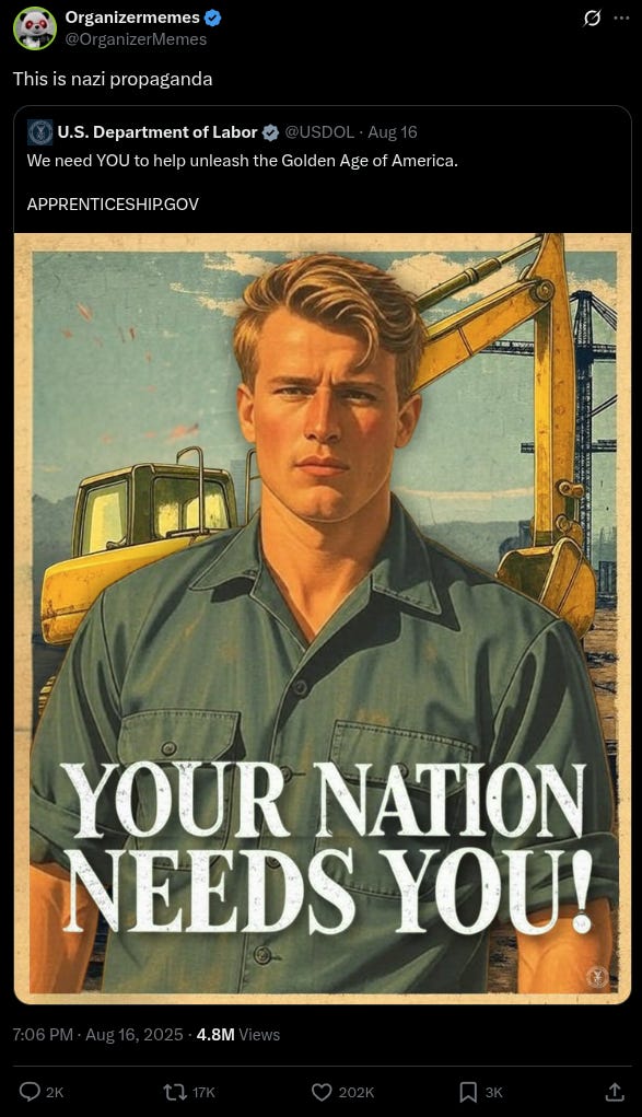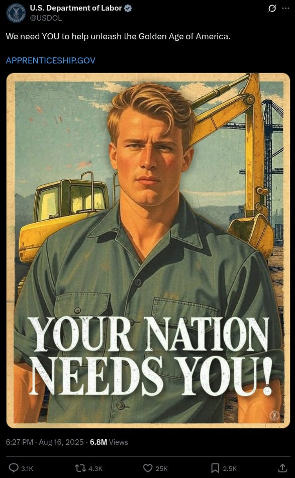 The USDL ad is vintage ‘your country needs you’ type ad featuring a young blue collar worker.