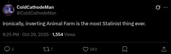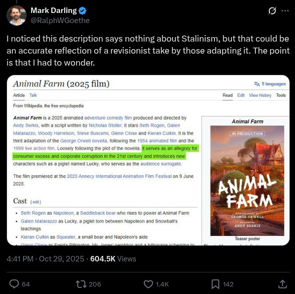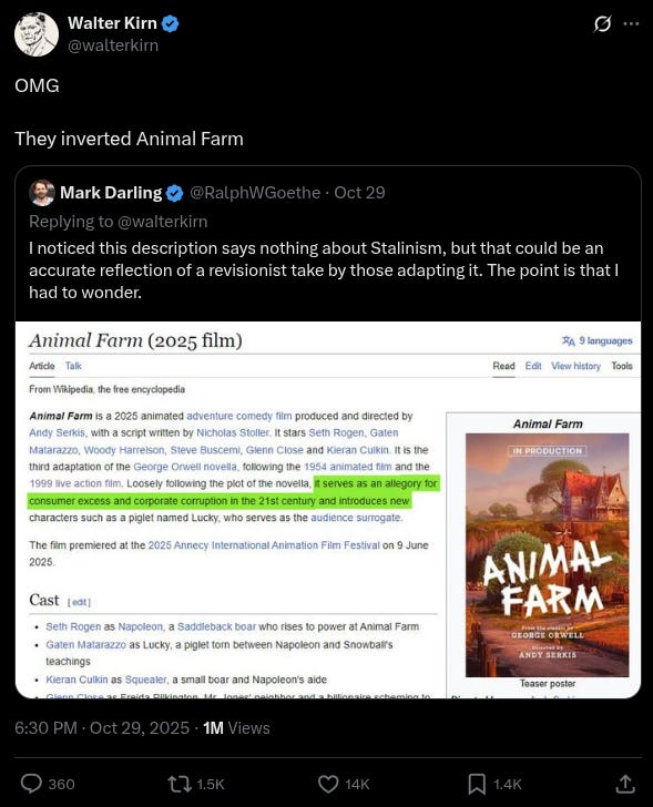 Even the new 2025 Andy Serkis movie adaptation, which reportedly soft-pedals the anti-communist bite for “broad appeal,” doesn’t pretend the book critiques capitalism; it simply dilutes the satire.