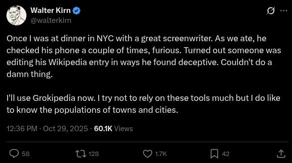 He noted, “I’ll use Grokipedia now. I try not to rely on these tools much but I do like to know the populations of towns and cities.”