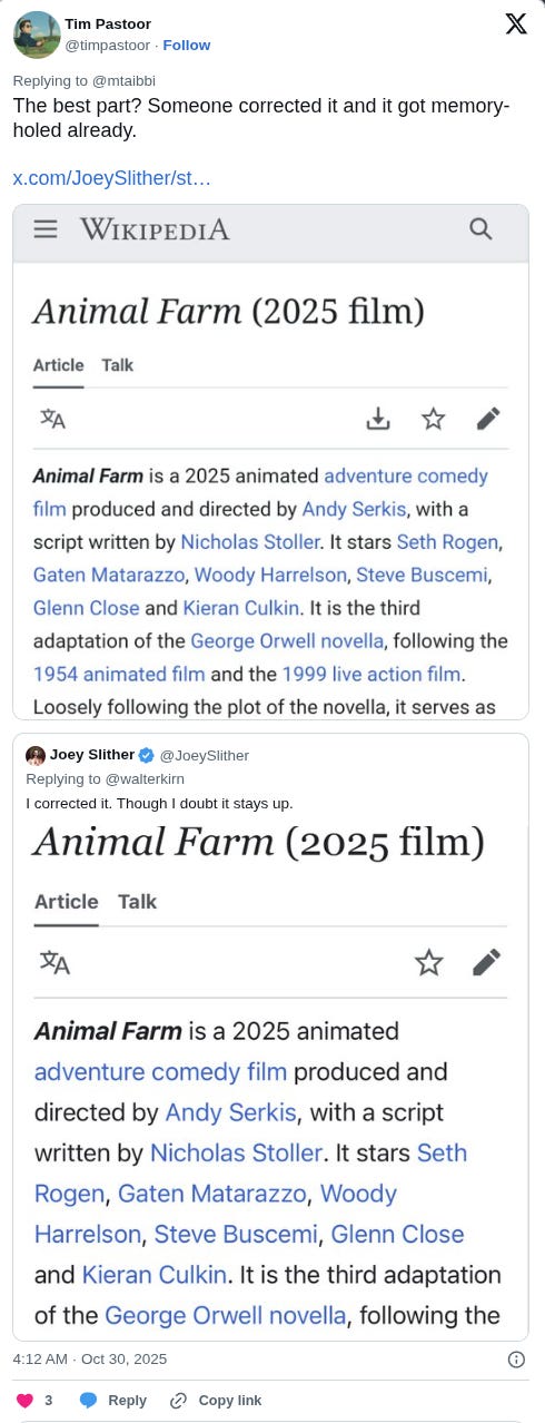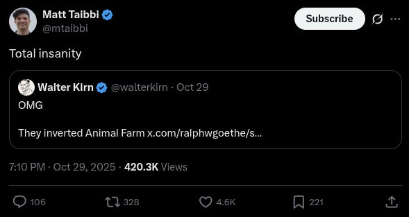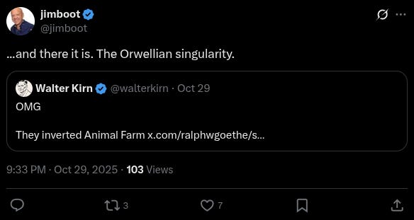 During an X discussion concerning the leftist bias of Wikipedia, one commenter pointed out that the website has completely inverted the intended theme of George Orwell’s novella Animal Farm.