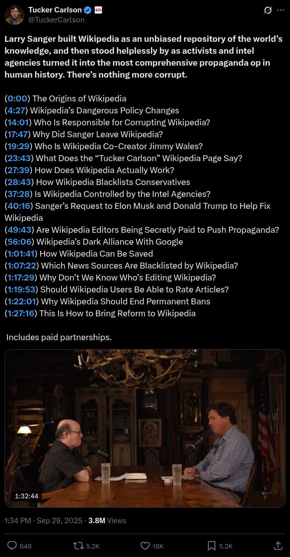 He lamented the site’s abandonment of its neutral point of view, attributing this to anonymous admins (80% of whom he said are untraceable) who enforce ideological conformity, and proposed “nine theses” for reform to restore balance, leaving Carlson visibly stunned as they navigated the site’s biased machinery live on air.