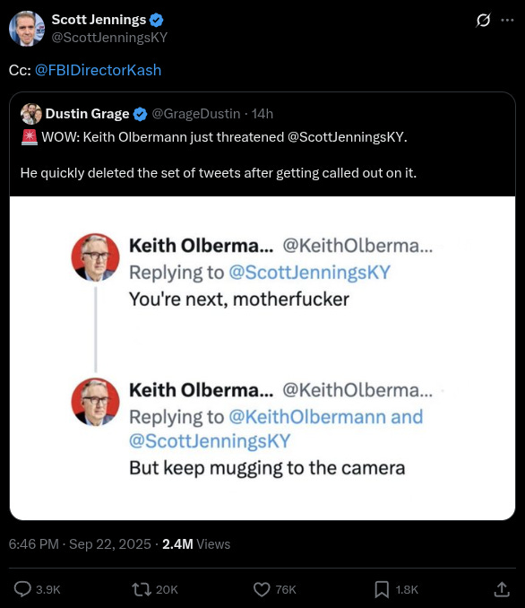 While the posts are no longer visible on Olbermann’s X account, Jennings reposted the screenshot and tagged FBI Director Kash Patel.
