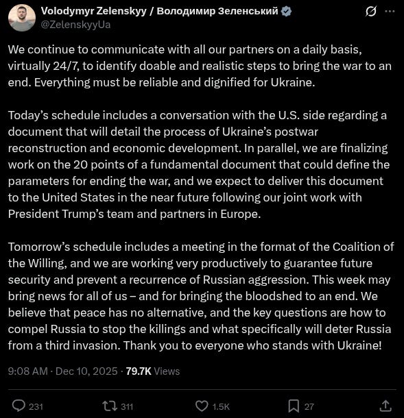 Today’s schedule includes a conversation with the U.S. side regarding a document that will detail the process of Ukraine’s postwar reconstruction and economic development. In parallel, we are finalizing work on the 20 points of a fundamental document that could define the parameters for ending the war, and we expect to deliver this document to the United States in the near future following our joint work with President Trump’s team and partners in Europe.