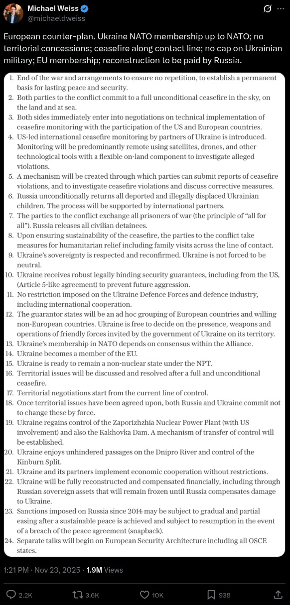 As for the US peace plan, it appears to have been primarily drafted by White House special envoy Steve Witkoff and Russian special envoy Kirill Dmitriev - but so far the Zelensky government has complained that it’s being cut out of the process.